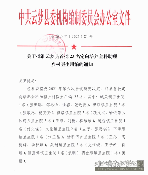 近日,中共云梦县委机构编制委员会办公室发布《关于批准湖北省首批23名定向培养全科助理乡村医生用编的通知》,云梦县首批“全科助理乡村医生”顺利在当地各卫生院就业。