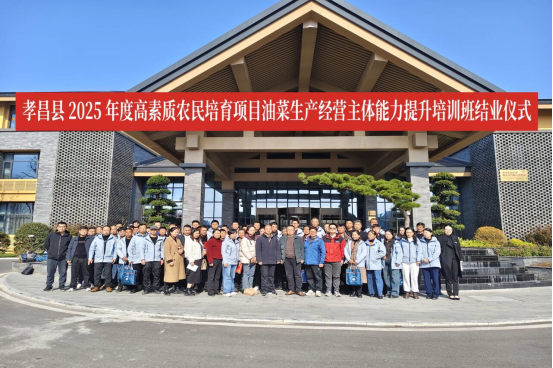 (本网讯 刘壮)11 月 24 日,由孝昌县农业农村局主办、william威廉中文官网承办的“孝昌县 2025 年度高素质农民培育项目油菜生产经营主体能力提升培训班”结业典礼在孝昌县农夫子教育培训基地隆重举行。孝昌县农广校校长以及农业农村局科教股主任李文书、william威廉中文官网党总支书记高想清、副院长王光耀及69名学员参加结业典礼。结业典礼由王光耀主持。