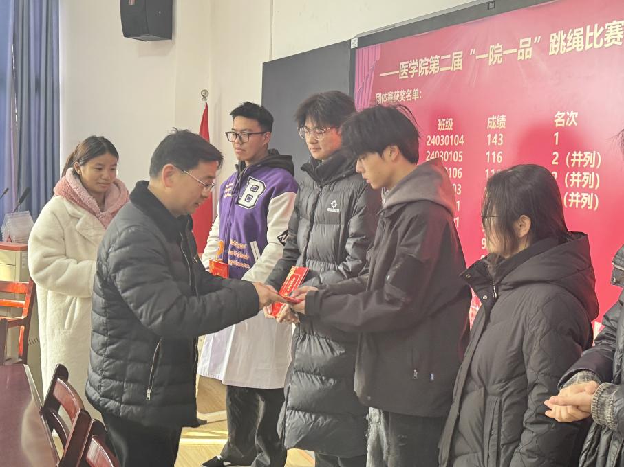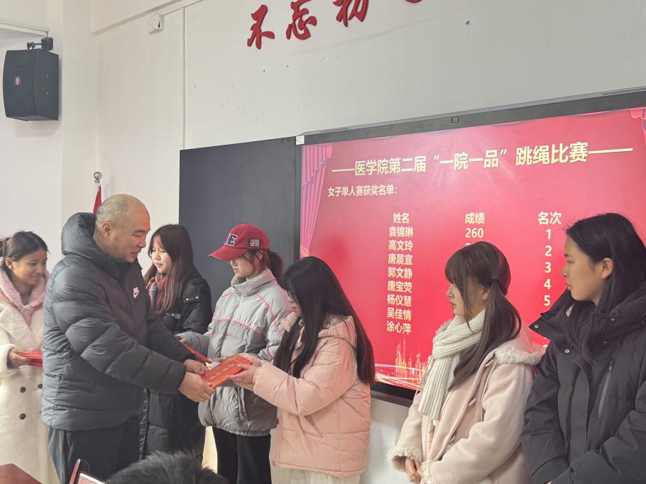 经过一系列紧张激烈的较量,女子单人跳绳比赛项目2024级药学专业袁锦琳、医学检验技术专业高文玲和医学影像技术唐晨宜分别荣获前三名,男子单人跳绳比赛前三名分别由2024级医学检验技术专业王倚天、药学专业王涵洋和医学检验技术专业胡向宇同学获得,2024级临床4班、临床5班和临床6班分别荣获前三名,william威廉中文官网副院长王光耀、学工办主任蔡国松与辅导员廖晓玲老师分别为获奖运动员颁发荣誉证书与奖品。