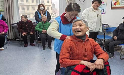 活动当天,蓝天医学社的志愿者们在指导老师王丹的带领下,早早地来到孝感市社会福利院。一进门,志愿者们便迅速融入其中,开启与老人们的温暖交流。有的志愿者凭借专业手法,轻柔地为老人按摩,手法娴熟,力度恰到好处,每一个动作都饱含着对老人的关怀;有的志愿者则坐在老人身旁,身体微微前倾,专注地陪老人聊天,静静倾听老人们讲述往昔岁月里那些或激昂、或温情的故事。整个现场,欢声笑语不断,温馨与融洽的氛围肆意流淌,老人们的脸上,无一不洋溢着幸福且满足的笑容。