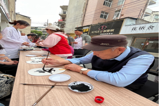 活动伊始,志愿者曹凤宇同学现场教学,带领居民体验传统非遗技艺——漆扇制作。在他的耐心细致的指导下,居民们用心调色、浸染、晾干,一把把色彩斑斓、图案独特的漆扇跃然眼前。随着志愿者们为社区居民们讲解和宣传国安知识,在场的活动参与者纷纷将“福”“安”等祝福文字书写在扇面上,一幅幅精美的扇面寄托在社区居民对国家安全、人民幸福的美好期望。一位热爱书法的社区老爷爷也主动加入,在一旁挥毫泼墨,与年轻志愿者们共同传承对祖国的美好祝愿。小朋友们也兴致勃勃参与其中,现场一片欢声笑语,老中青少齐聚一堂,其乐融融。