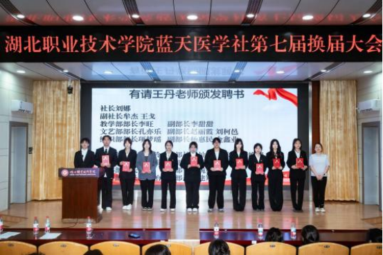 邓彬新充分肯定了上一届社团的辛勤付出,分享了过去一年蓝天医学社在组织各类社团活动方面所取得的成绩。从精彩纷呈的社团文化节到形式多样的公益活动,从社团间的协作交流到对社团骨干的培养,每一项工作都凝聚着团队的心血与努力。王丹指出,希望新一届社团干部大胆创新,利用专业知识开展更有意义的社会实践活动,将医学社打造成更具影响力的湖职校园社团品牌。