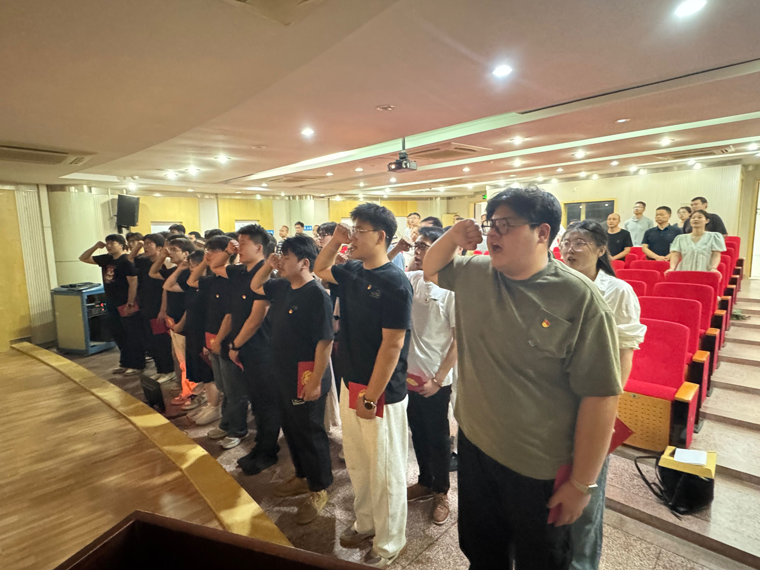 随后举行了庄严的入党宣誓仪式。在领誓人的带领下,全体学生党员面向鲜红党旗,高举右拳,用铿锵有力的誓言许下了对党的忠诚承诺。丁路路和孙傲分别代表预备党员和转正党员进行发言,他们承诺将以党员的标准更加严格地要求自己,发挥先锋模范作用,并向中国共产党致以最崇高的敬意。
