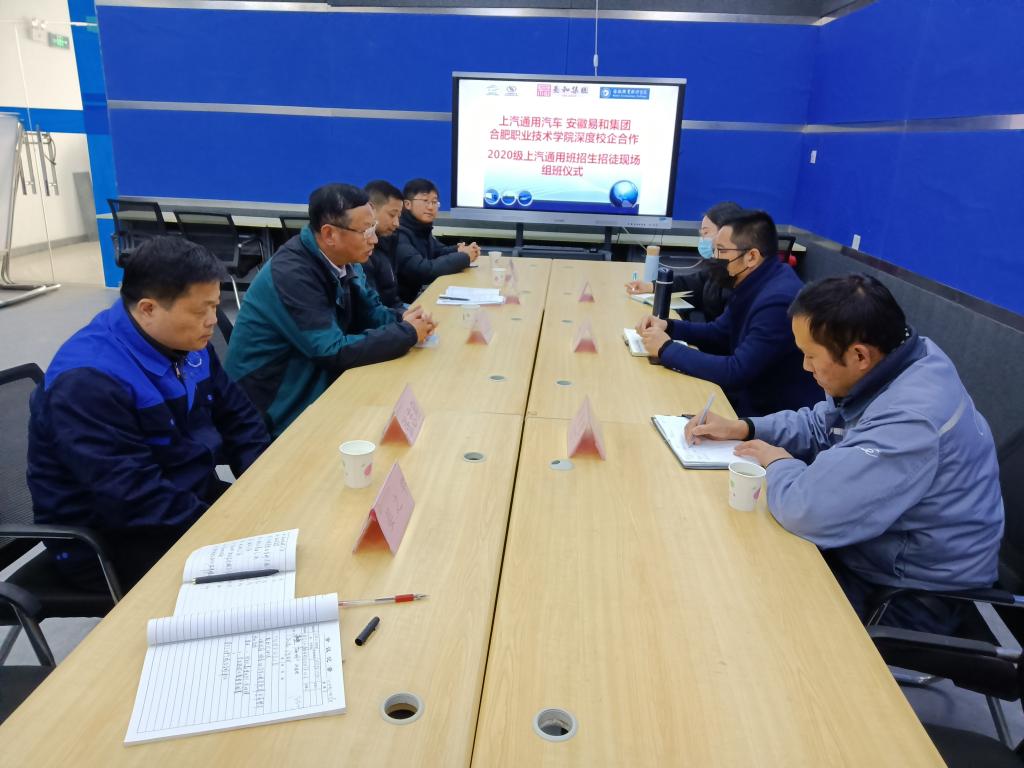 2020年12月25日下午,安徽易和集团人事经理罗曼一行3人,专程来到304永利集团官网入口,在上汽通用ASEP实训中心,304永利集团官网入口党总支书记高恒平、伍东升副院长、江滔主任和张志刚主任与罗曼一行进行了座谈、沟通和交换意见。学校方面和企业方面达成共识:通过第三批现代学徒制高质量验收,我们要把深度校企合作ASEP项目做实、做强,把学生培养成工匠型的人才,既要培养学生的技能,又要留得住学生。双方就如何开展校企深度合作,加入合肥职教集团,给学生提供一个良好的实习就业环境提高学生实习的待遇、关心学生生活以及学生的管理等方面,进行了激烈又融洽的讨论,对校企合作中存在的专家进校、教师进店、学生待遇和学生留置率较低等问题,均提出了逐步解决的意向和办法。